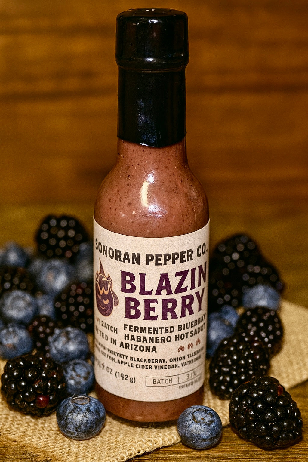 A bold blend of sweet blueberries and fiery habaneros, this sauce offers a unique combination of fruity sweetness and intense heat, perfect for adding a surprising kick to your favorite dishes. 5 oz bottle.