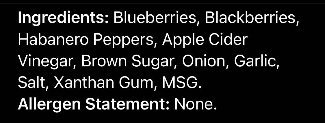 Ingredients: Blueberries, Blackberries, Habanero Peppers, Apple Cider Vinegar, Brown Sugar, Onion, Garlic, Salt, Xanthan Gum, MSG.