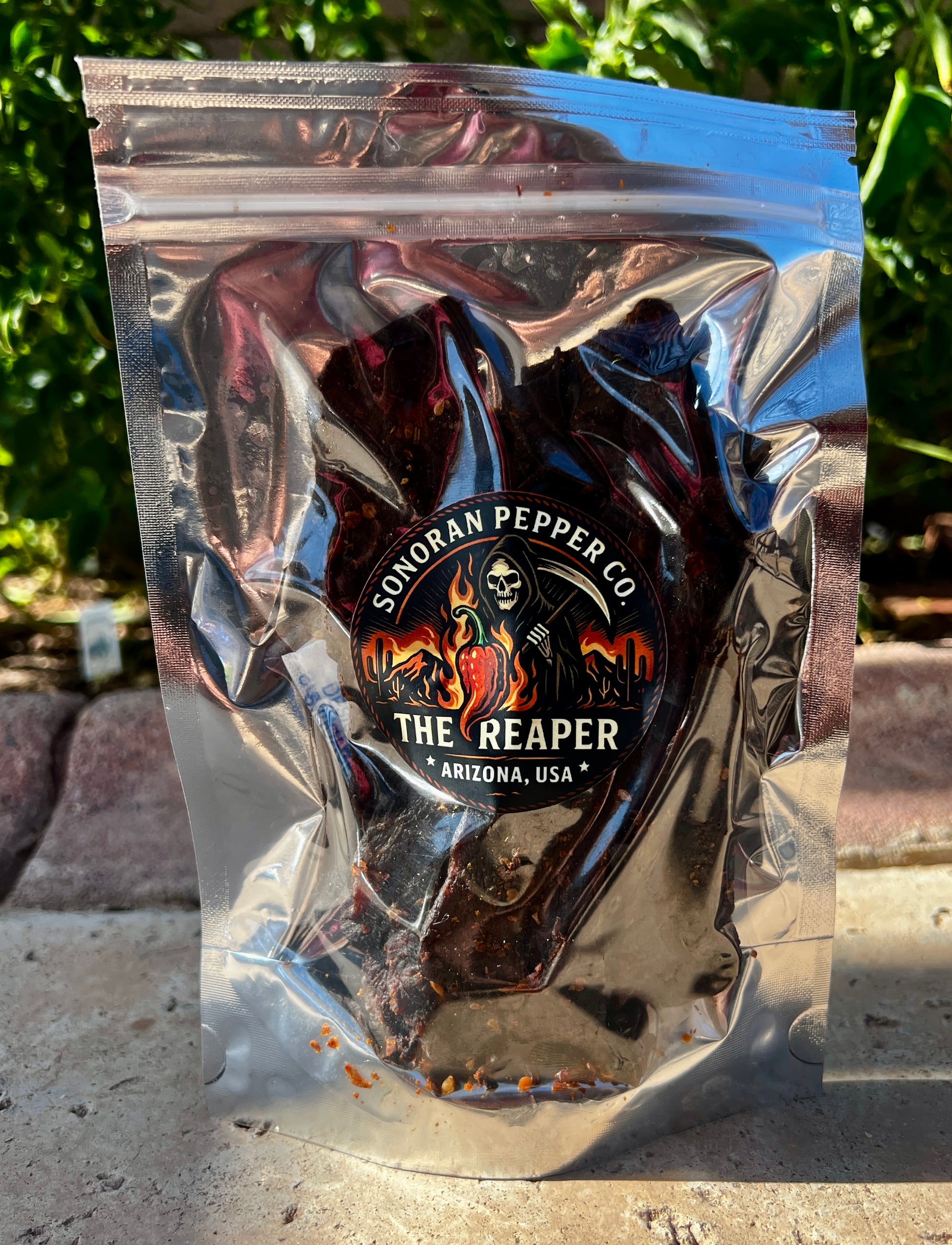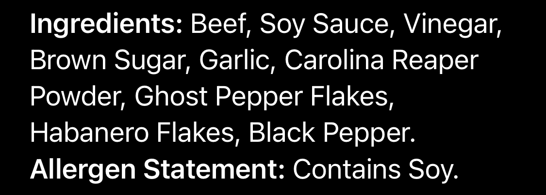 Ingredients: Beef, Soy Sauce, Vinegar, Brown Sugar, Garlic, Carolina Reaper Powder, Ghost Pepper Flakes, Habanero Flakes, Black Pepper.